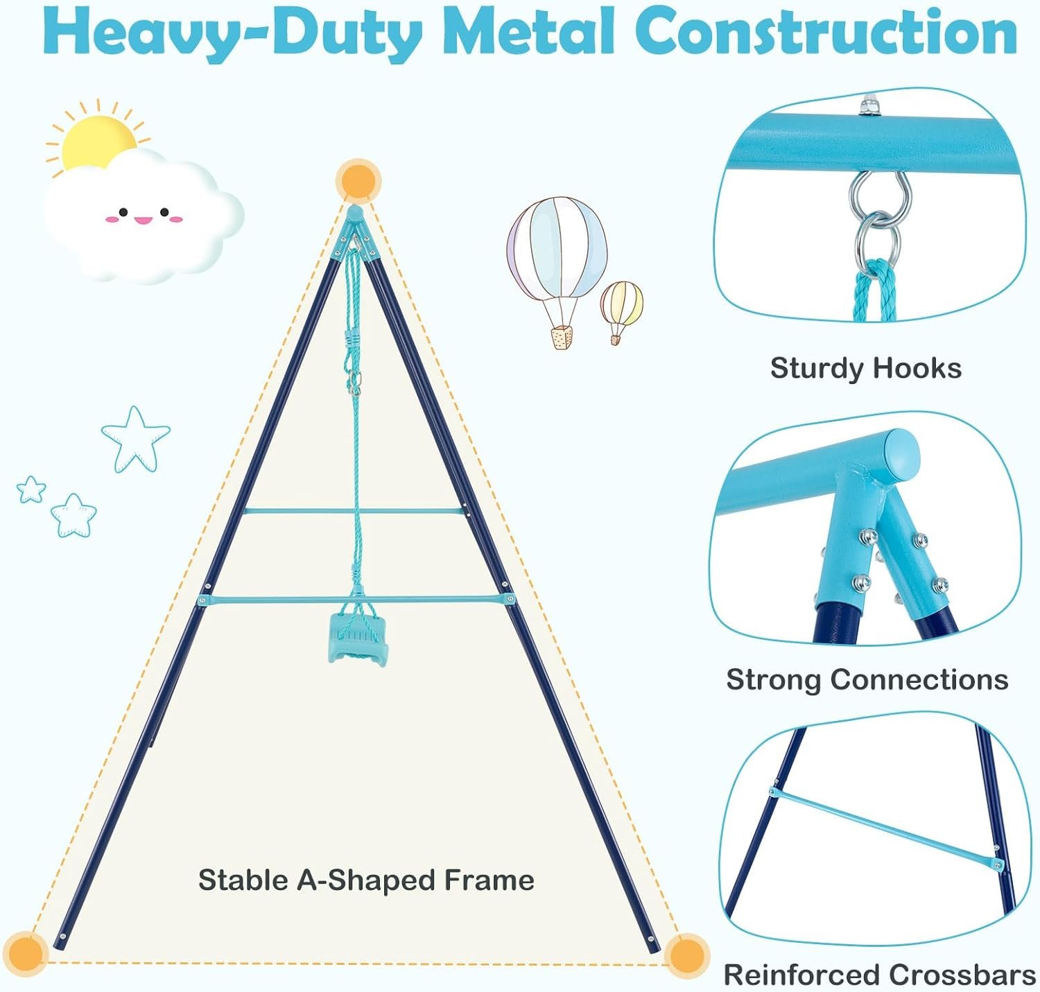 | Material | Heavy-duty Steel Pipe (Frame), PE Rope (Swing), Plastic (Seat) |